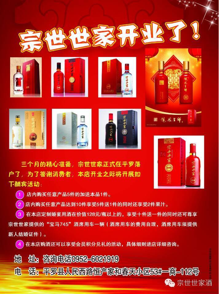 2014年7月5日,宗世世家专卖店正式落户平罗,在平罗社会各界的热烈拥捧中盛大开业。
